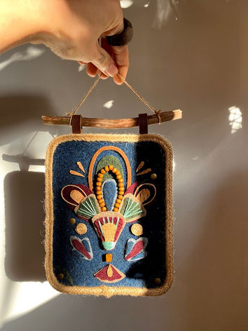 Me questionar quanto a isso me leva a olhar com mais cuidado para o que já tenho e para o que está ao meu alcance. Essas colagens foram criadas com retalhos de feltro do meu antigo ateliê, contas de madeira e elementos naturais colhidos em andanças e viagens.